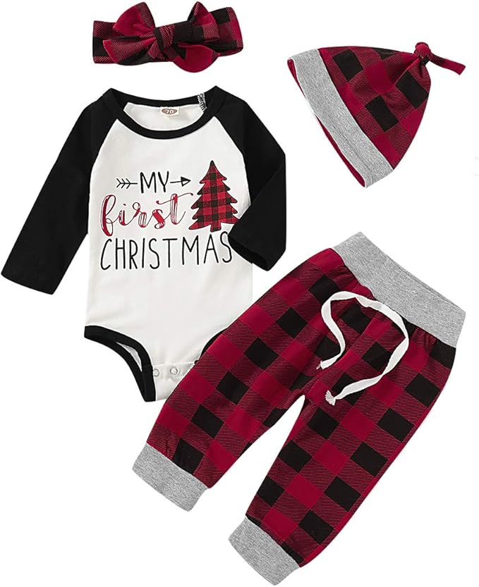 My First Christmas 4pcs Plaid Outfit Newborn Baby Boy Girl Raglan Rompers Drawstring Pant Set